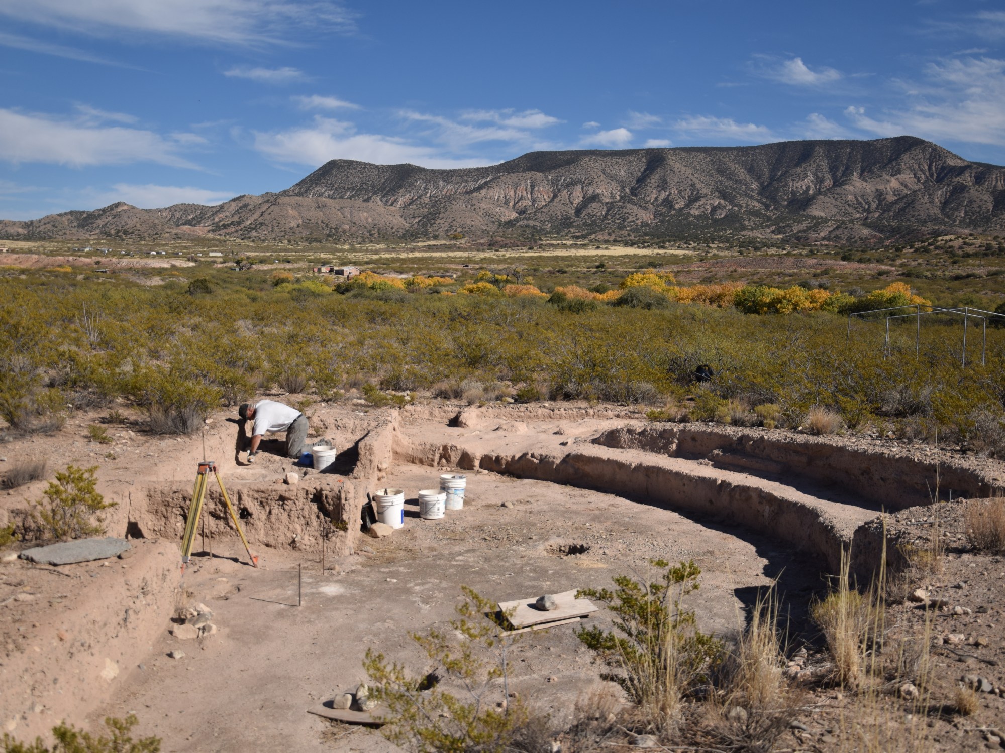 It’s a predictably sunny day in the Chihuahuan Desert of southern New Mexico and the cottonwood trees lining the Tularosa Creek glow copper in midmorning rays. I relish their rare shade on a walk downstream to a small wooden bridge, to the far side of the Tularosa Canyon. I then bat away prickly mesquites and creosotes that poke at my shins on the hike over to a round, semi-subterranean ceremonial structure known as a great kiva. It’s still partially buried in the arid earth, so I fall to my knees, grab my trowel, and begin the meditative work of unearthing this ancient structure—one tiny scrape at a time.